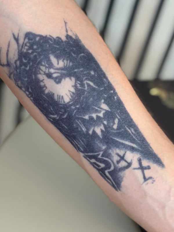 Retirez le film protecteur du tatouage et appliquez-le sur votre peau, face adhésive contre la peau. Repérez le coin détachable et décollez le bord en papier. Appuyez fermement pour une adhérence optimale. Humidifiez légèrement le tatouage, soit directement dessus, soit à l'aide d'une éponge, et laissez agir environ une minute.